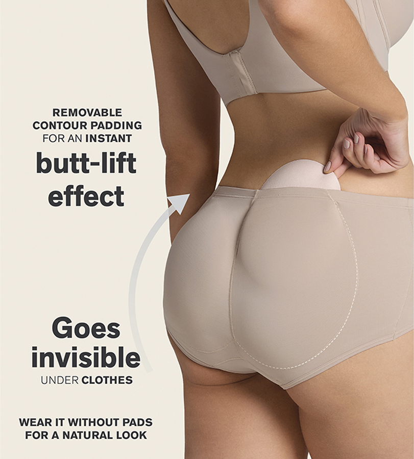 يتميز مشد السروال المبطن لتكبير وشد المؤخرة -هذا المشد السحري لشد المؤخرة- باحتوائه على حشوة قابلة للإزالة وذلك لإضافة شكل و حجم إضافي للمؤخرة وتكبيرها. لا حاجة للجراحة! يحتوي سروال تكبير المؤخرة على طبقات مسطحة للغاية لذا فهو غير مرئي تحت ملابسك فلا داعي للقلق! يعمل السروال المبطن لتكبير وشد المؤخرة هذا على تكبير المؤخرة بشكل طبيعي وجذاب من غير إظهار خطوط اللباس الداخلي المزعجة. لقد تم تصنيع هذا اللباس الداخلي المميز من قماش مطاطي ناعم حتى تتمكن من تعزيز المؤخرة بشكل مريح طوال اليوم وطوال الليل وطوال فترة ارتدائك له.