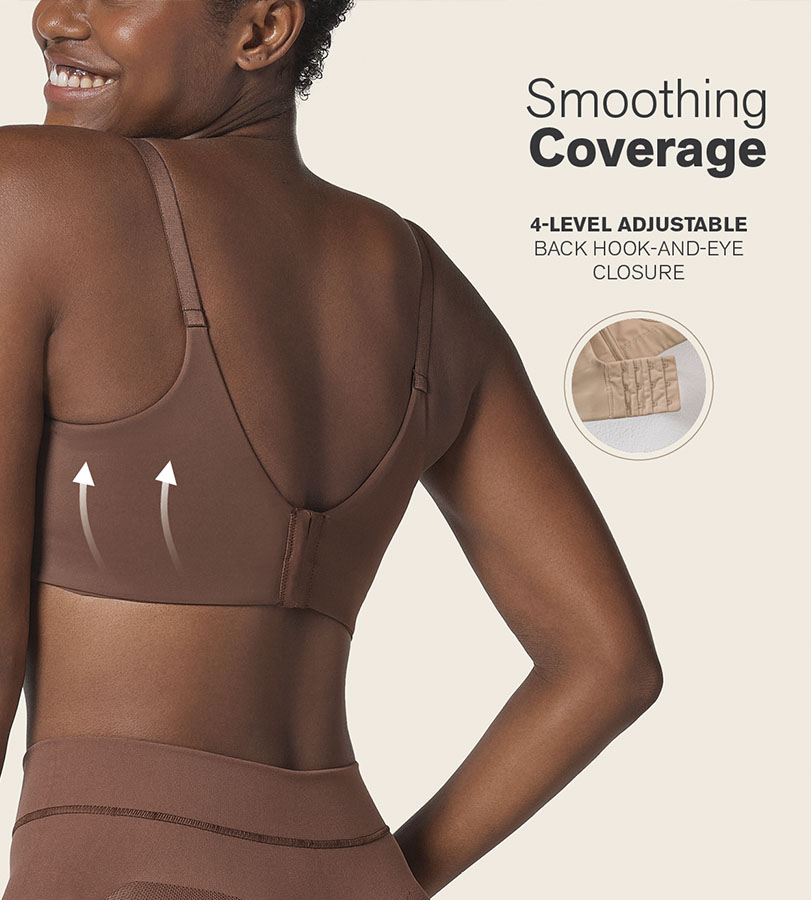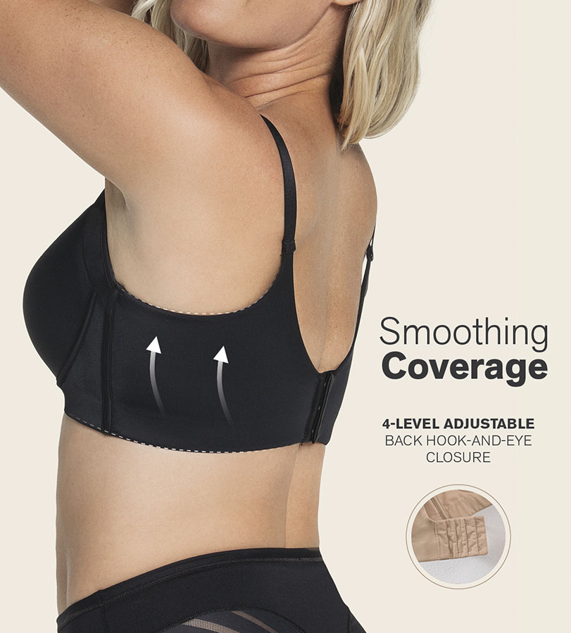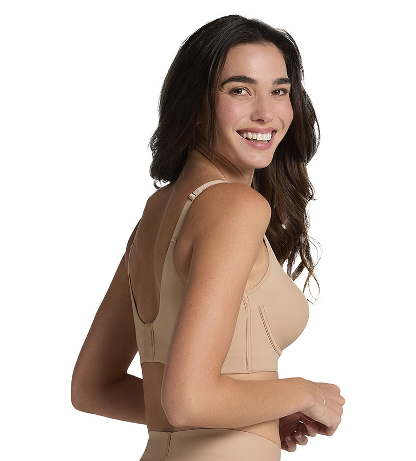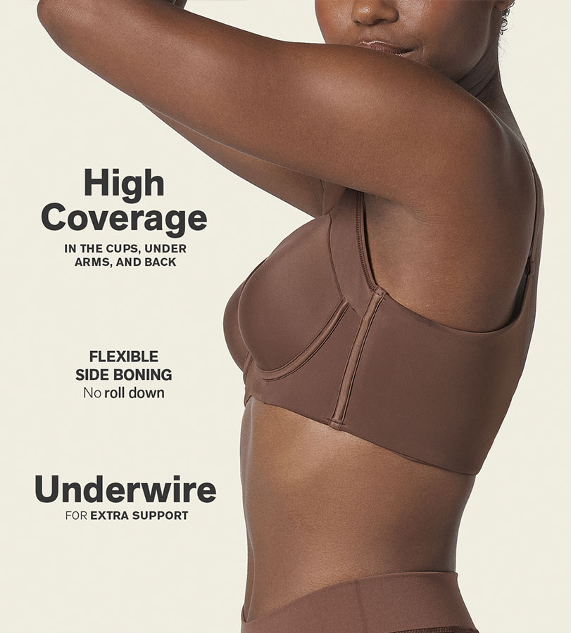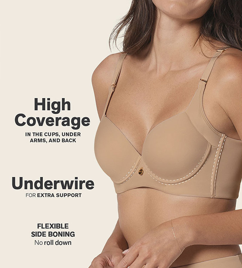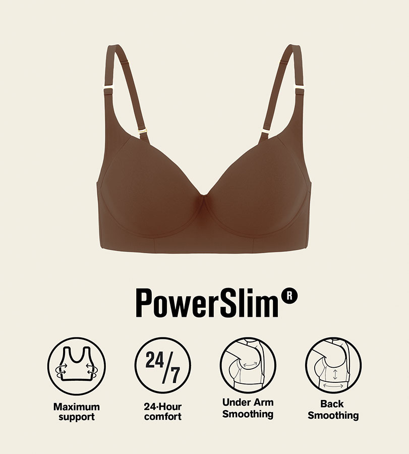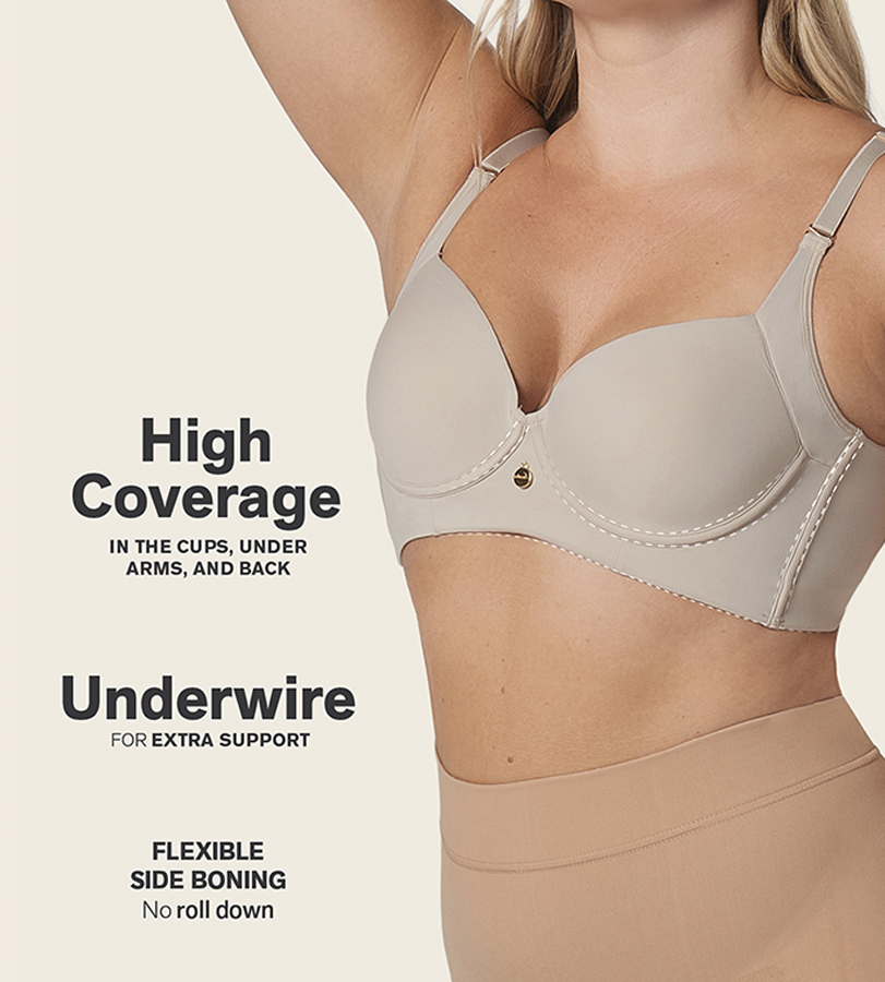 شد للصدر والجانبين: أربطة عريضة من أنسجة PowerSlim® لنحت أسفل الثديين وأسفل الإبطين، وبتغطية عالية.