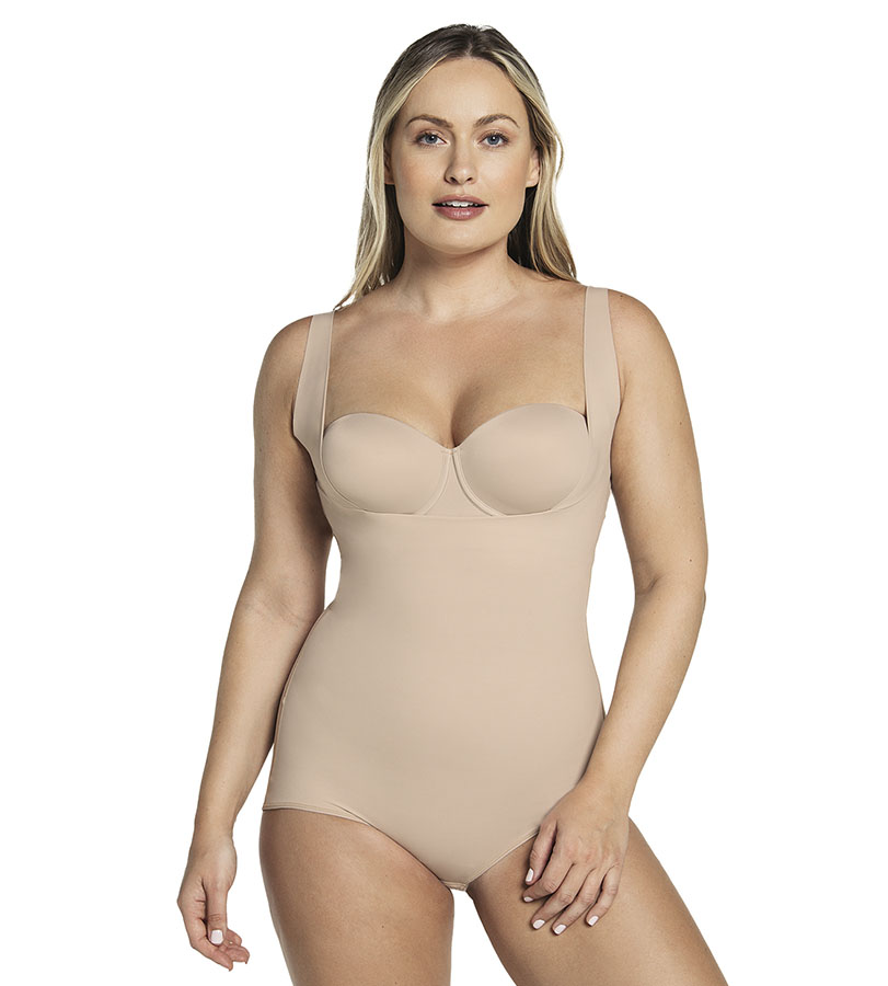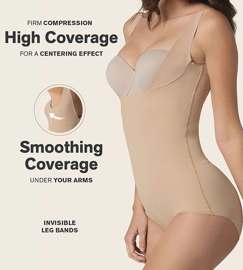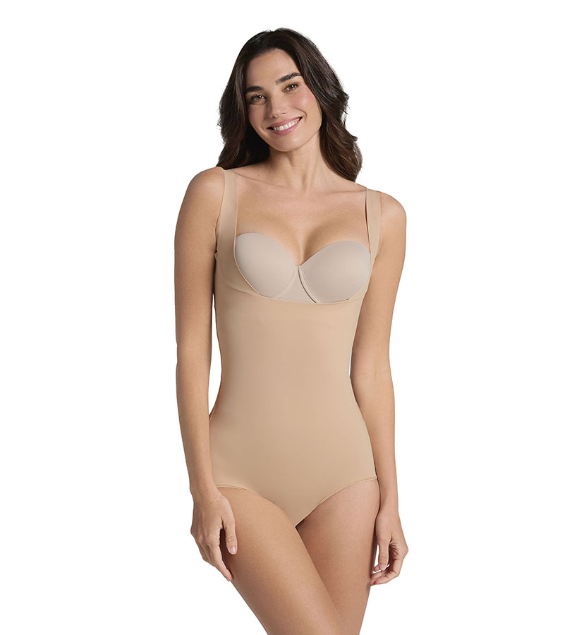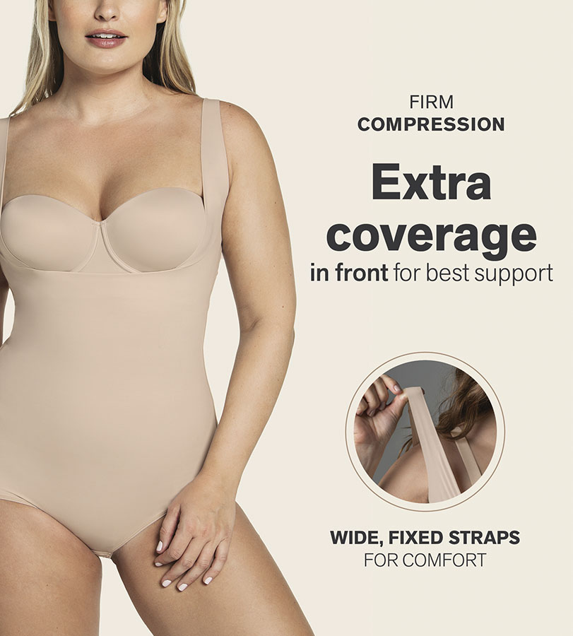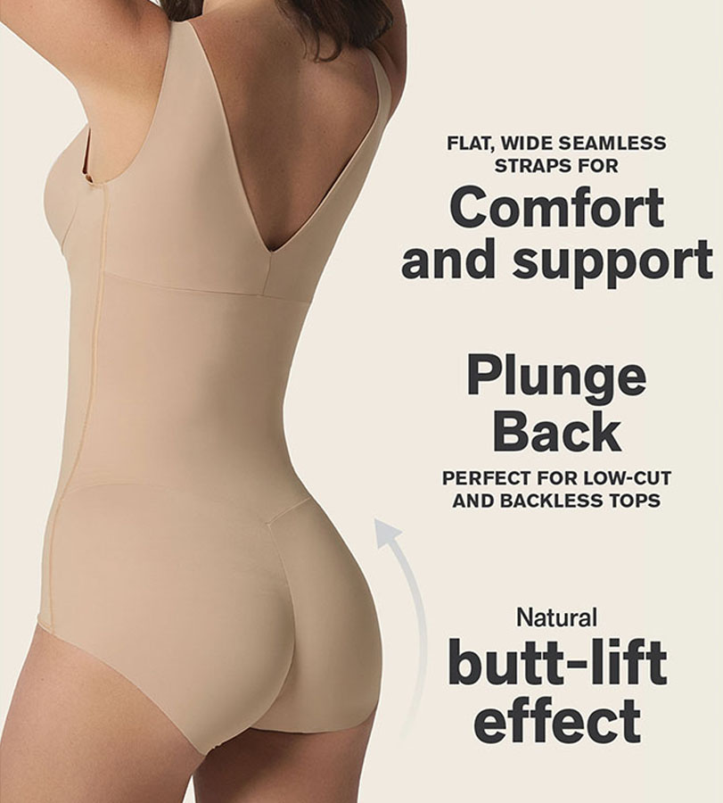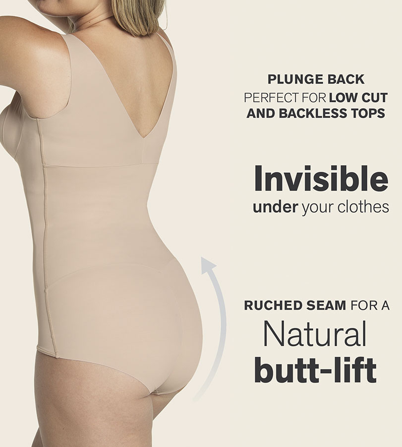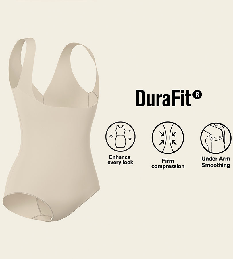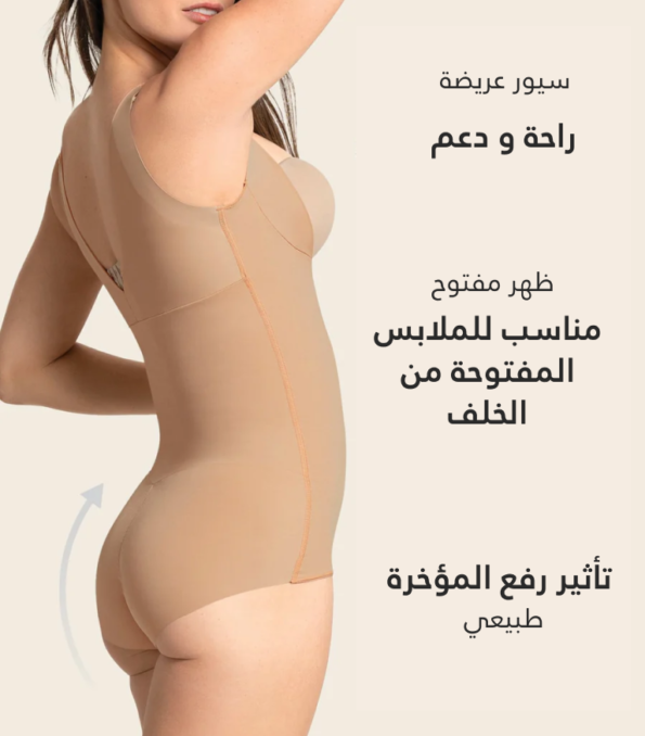 مصنوع من قماش  ال DuraFit®  الفائق النعومة، وعالي الضغط، يأتي بطبقات مزدوجة لتمنح البطن والظهر ضغطًا قويًا للحصول على تأثير النحت!  ومزود بأحزمة عريضة وظهر متوسط الانخفاض مما يجعل مشد بودي سوت لنحت الجسم مناسب للفساتين المفتوحة من الخلف.وهناك أيضًا درزات مكشكشة في الخلف للحصول على تأثير رفع المؤخرة. مثالي للارتداء اليومي او للمناسبات!